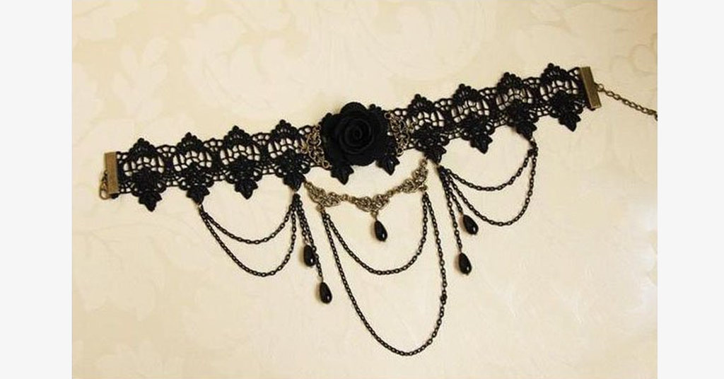 With a large black colored feature rose pendant on an enchanting black lace choker this necklace will make a bold statement. Great to wear with any formal outfit, with dangling black beads and loose hanging chains for added depth and character.