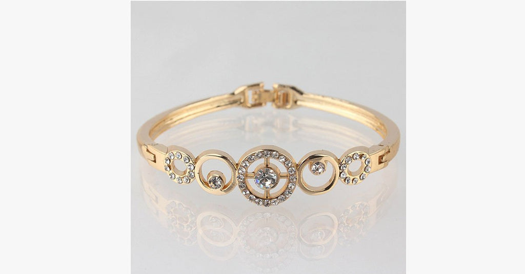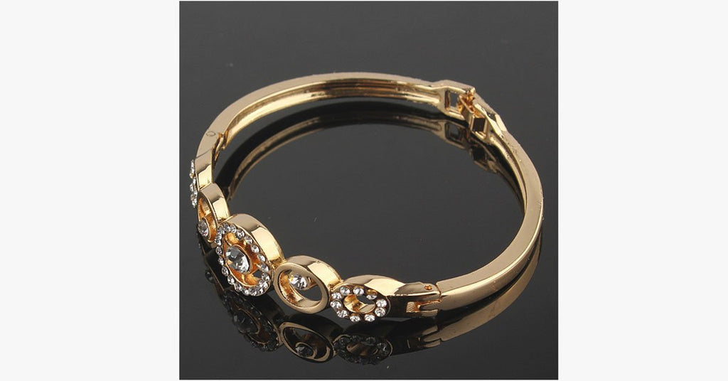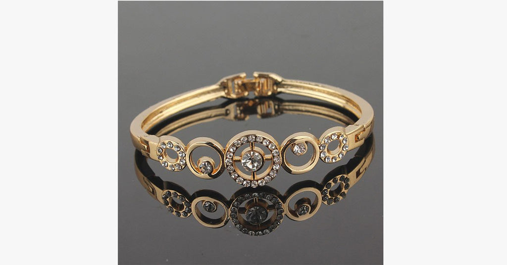 This elegant gold bangle is carefully detailed with white crystal elements for added sparkle and shine, making it the perfect piece to style with any formal outfit. Easy to wear with a pinch clasp for secure closure, this classy bangle makes a wonderful gift to share on any special occasion.
