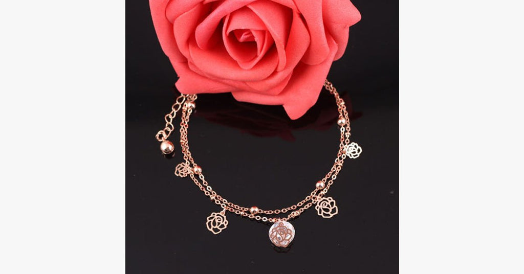 Beautifully deatiled with rose charms and sparkling rhinestones this anklet is a truly gorgeous piece that will add instant class to any formal outfit. The dangling cutout rose charms will give you a fun flirty look that will be sure to set you apart from the crowd. A wonderful gift to share with the one you love most!