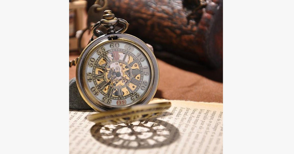 This Antique Gold Pocket Watch has a classic design with a modern twist.  The cover of the watch itself is crafted with skeletal features, allowing you to see the time without having to open the case.  There is also a visual cut-out through the face of the watch that allows a front and rear view of the gear work within the time piece.  The back cover of this pocket watch is subtly engraved  with delicate vine motifs, giving it an elegant finish to contrast the modern bold numbers placed on the front of the case. The Antique Gold Pocket Watch also includes a chain and Roman Numeral Dial  for an elegant finish that would add sophistication to any man's wardrobe.