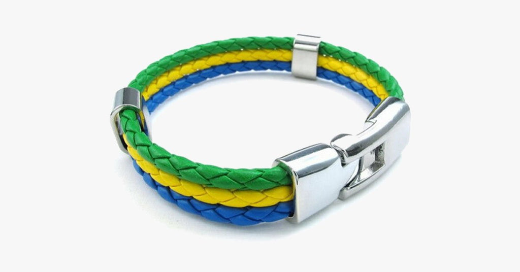 This eye-catching leather bracelet features quality leather in blue, yellow and green representing the colors of the flag of Brazil. If you are an Olympic Games supporter for Brazil then this bracelet is for you! Order now for you and your friends and support your country this summer.