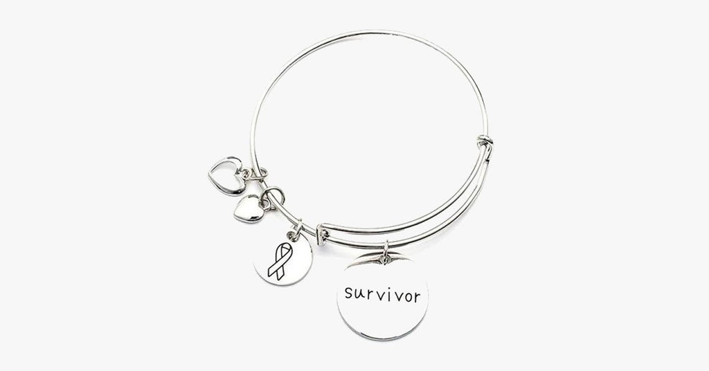 A special dedication for every cancer survivor. We'd like to celebrate and hear your many stories and the hurdles you've had to overcome. Whether you personally know of a survivor or have been diagnosed with cancer, we urge you to help raise awareness and funds towards the cause. Wear this classic Silver Survivor Charm Bangle as a symbol of your support. Designed with suspended heart charms and a carefully hand-stamped ribbon and "survivor" etched on its flat circle pendant, this pretty accessory is sure to spark conversation and inspire others to help!