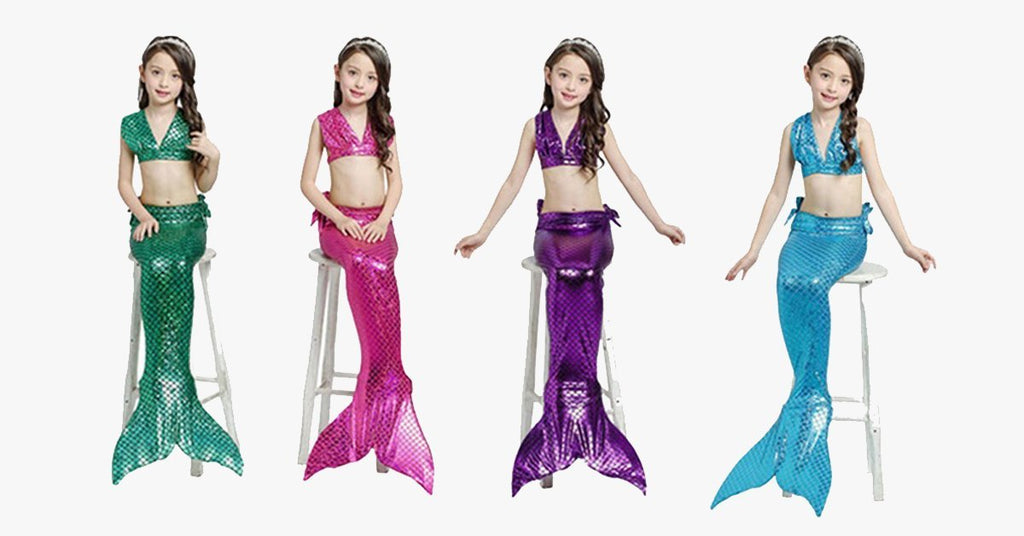 This Girls' Mermaid Swimwear Set (4-Piece) is made of polyester, spandex and nylon, you can turn on the button of the tail for walking or close for adding monofin when swimming, which is very convenient.