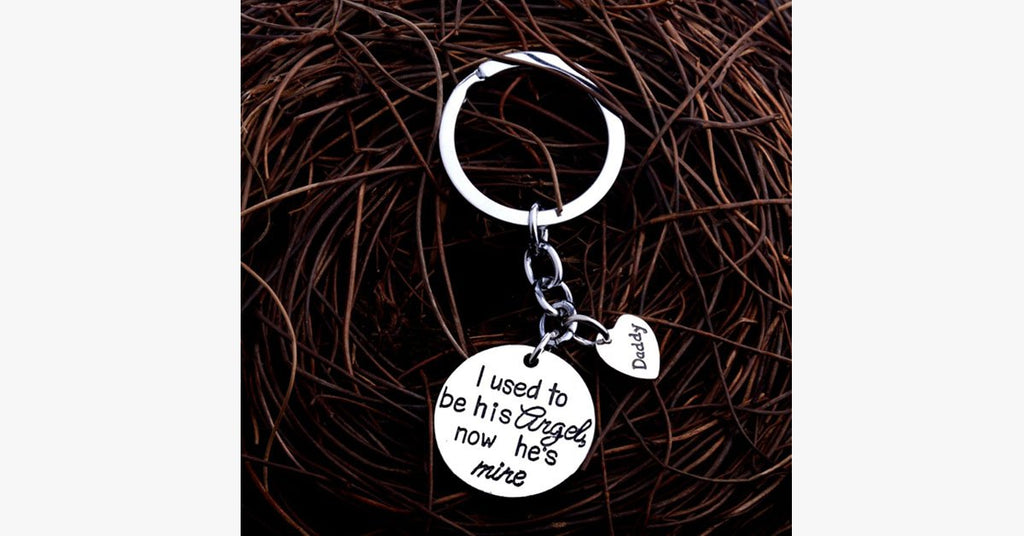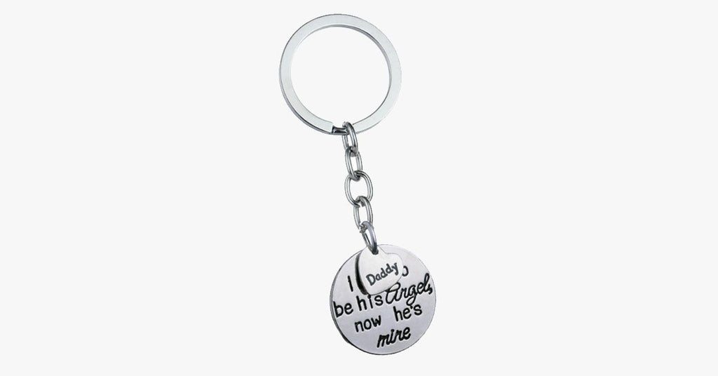 Silver plated, round shaped key chain with beautifully engraved words "I used to be his angel, now he's mine". This makes a perfect gift for a father on his special day.
