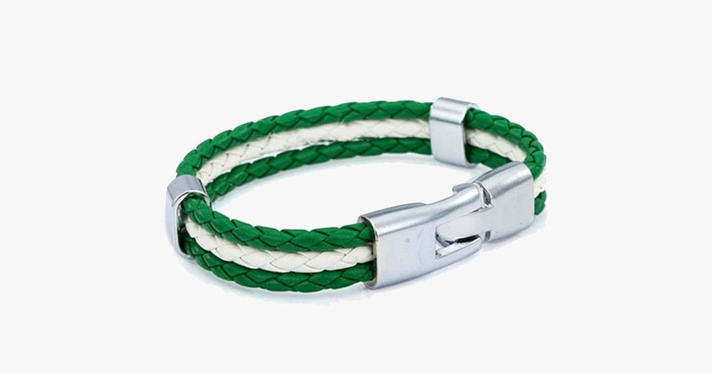 This eye-catching leather bracelet features quality leather in green and white representing the colors of the flag of Nigeria. If you are a UEFA EURO2016 or Olympic Games supporter for Nigeria then this bracelet is for you! Order now for you and your friends and support your country this summer.