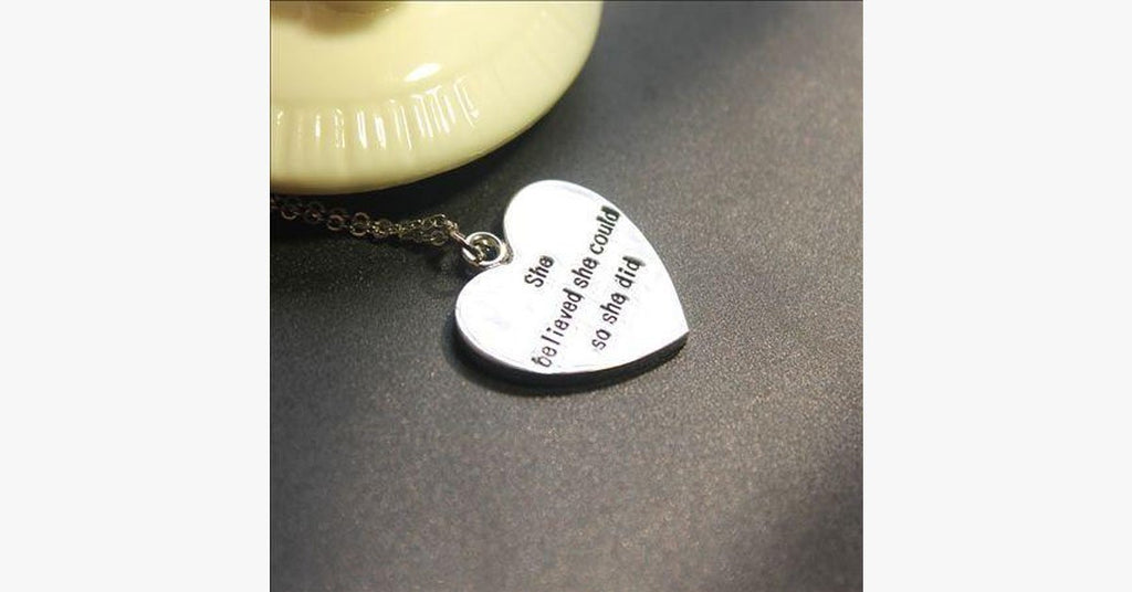 This classic silver piece is a truly timeless accessory that any women would love to sport. This engraved This simple yet elegant silver plated heart is symbolic for the remarkable things we ladies are capable of! Gift this precious piece to someone who inspires you or why not treat yourself! The words engraved at the center of the heart "She believed she could so she did" is an excellent motivator and helps is to dig deep and dream big! Make a statement with this necklace by staying bold and looking classy!