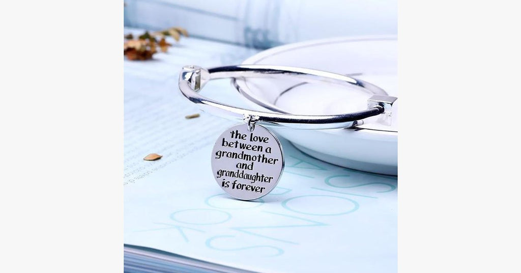 Solidify the bond you share with your beloved granddaughter with this Silver Pendant Charm Bangle. For everyday wear this trendy bangle works well with any outfit! We absolutely adore its circle charm pendant suspended with its personalized hand-stamped engraving, "The love between a grandmother and granddaughter is forever". Its perfect silver cube to match, adds a unique touch to tie this pretty piece together. Gift this to that special granddaughter or grandmother of yours and they'll always have that sweet reminder of just how loved they are.