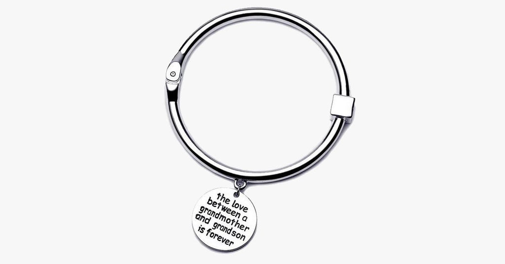 Solidify the bond you share with your beloved grandmother with this Silver Pendant Charm Bangle. For everyday wear this trendy bangle works well with any outfit! We absolutely adore its circle charm pendant suspended with its personalized hand-stamped engraving, "The love between a grandmother and grandson is forever". Its perfect silver cube to match, adds a unique touch to tie this pretty piece together. Gift this to that special grandmother of yours and they'll always have that sweet reminder of just how loved they are.