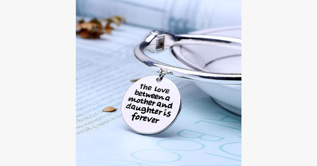 Solidify the bond you share with your beloved daughter or mother with this Silver Pendant Charm Bangle. For everyday wear this trendy bangle works well with any outfit! We absolutely adore its circle charm pendant suspended with its personalized hand-stamped engraving, "The love between a mother and daughter is forever". Its perfect silver cube to match, adds a unique touch to tie this pretty piece together. Gift this to that special daughter or mother of yours and they'll always have that sweet reminder of just how loved they are.