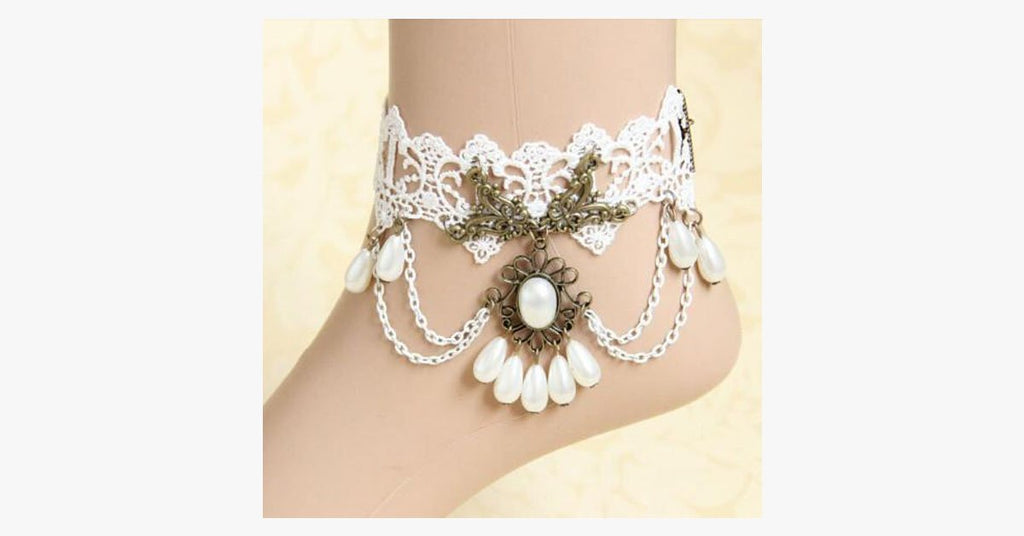 This White Lace Anklet is the answer to all your summer accessory needs.  Enjoy it with any summer dress or for an added touch for a day at the beach.  This anklet is made with delicate white lacework, and detailed with classic dangling pearls.  A beautiful vintage-inspired design with a dark gold metallic finish for a classic look any jewelry lover would appreciate.